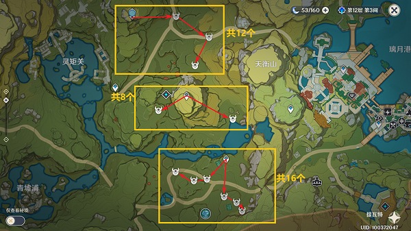 6、在天衡山左边是有三个位置上是有鸦印的,第一条12个,第二条8个,第三条16个。